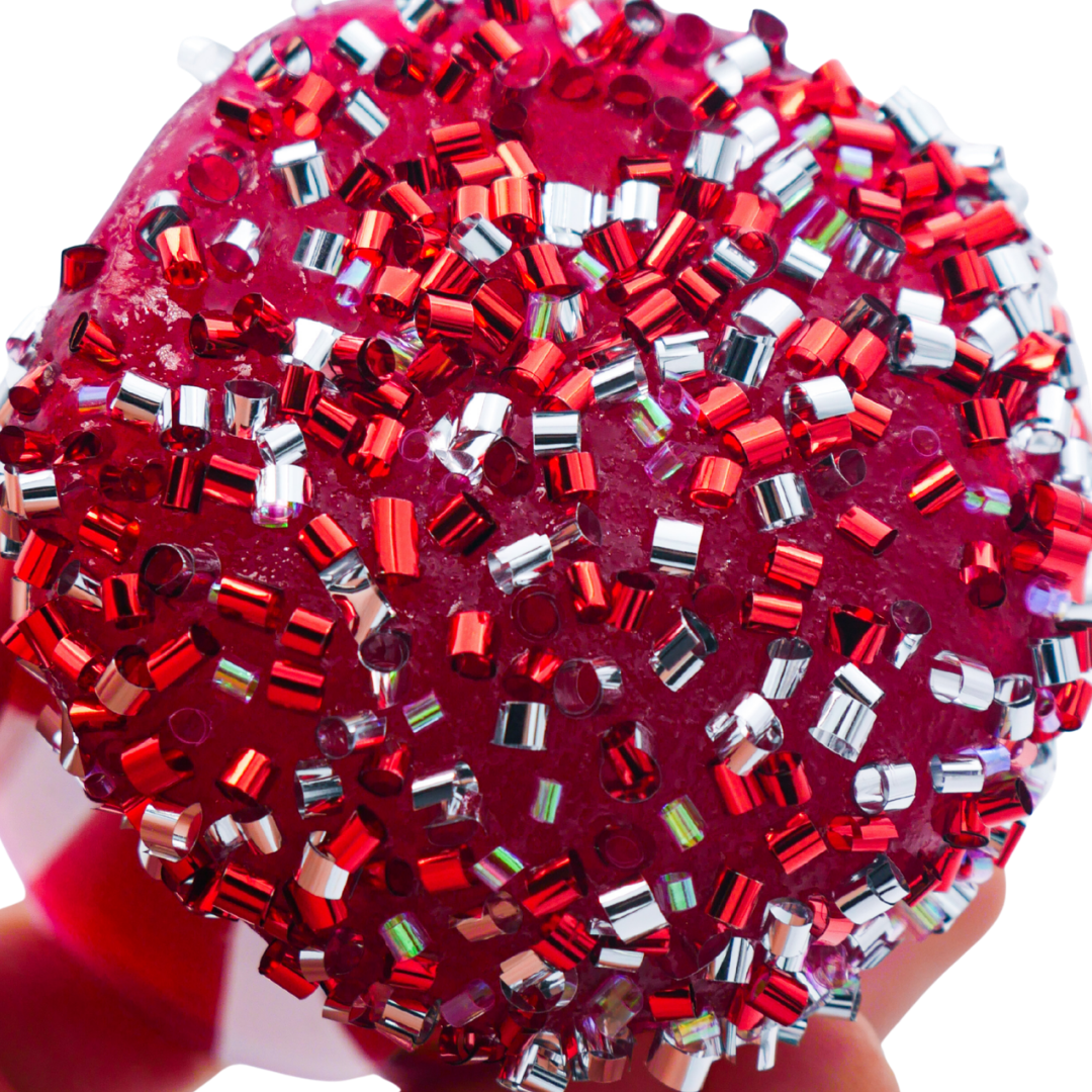 Slime intens, roșu rubiniu, inspirat din bomboanele juicy. Arată ca un desert plin de topping și scoate sunete ASMR puternice. Foșnește, crapă și face pop-uri perfecte.