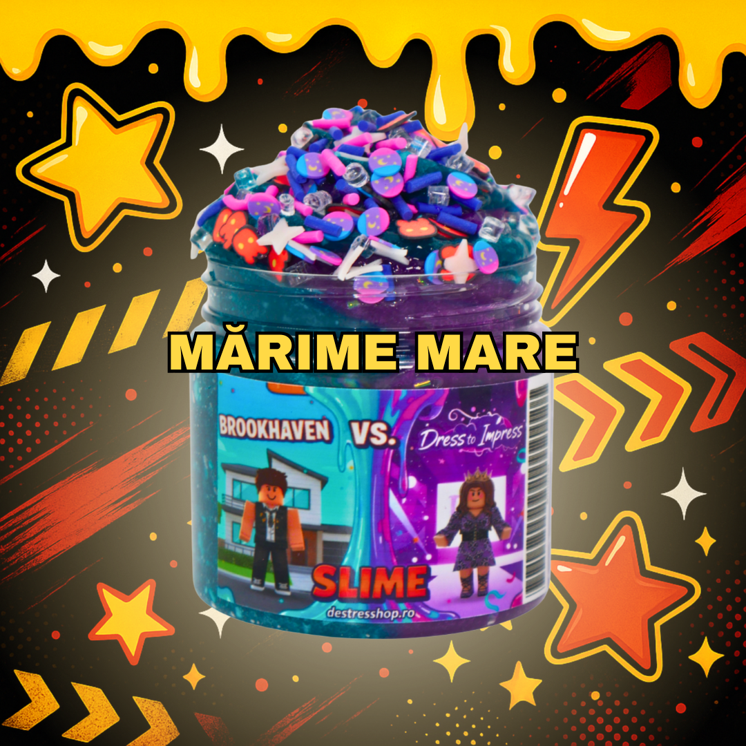 • 1 borcănaș de slime BROOKHAVEN VS DRESS TO IMPRESS SLIME – Textură SNOWFIZZ CRUNCHY+DESTRES DOUGH, cu efecte vizuale spectaculoase și întinderi lungi.