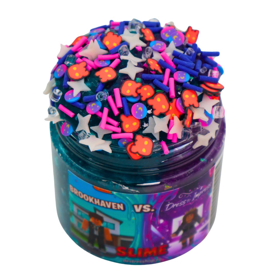 Slime inspirat din universul Brookhaven Roblox, cu efecte vizuale intense mov-turcoaz. Este plin cu confetti și glitter, perfect pentru poze și videoclipuri ASMR. Se întinde ușor, lucios și elastic.